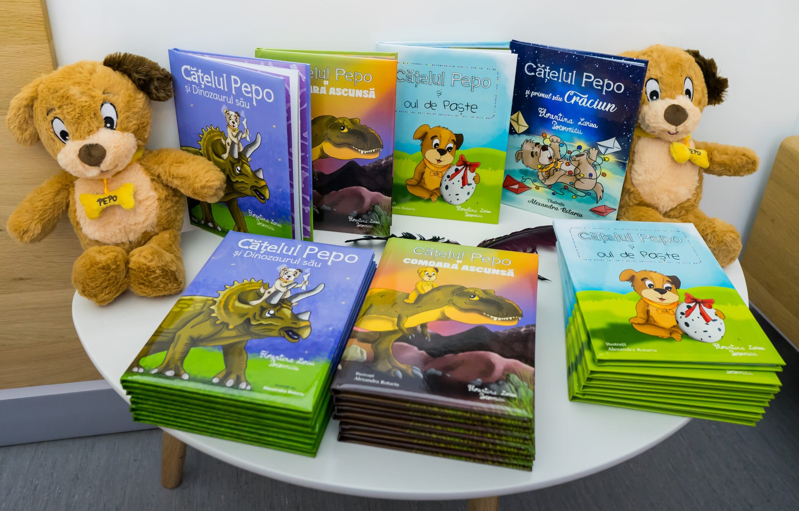 Catelul Pepo si oul de Paște: Pepo, cațelul cel curajos, afla ca dinozaurii ies din oua si pleaca in cautarea lor. Chiar daca prietenii nu-l susțin, Pepo reușește sa gaseasca fosile alaturi de un personaj misterios (44 pagini, dimensiune 21 x 16 cm, copertă buretata)