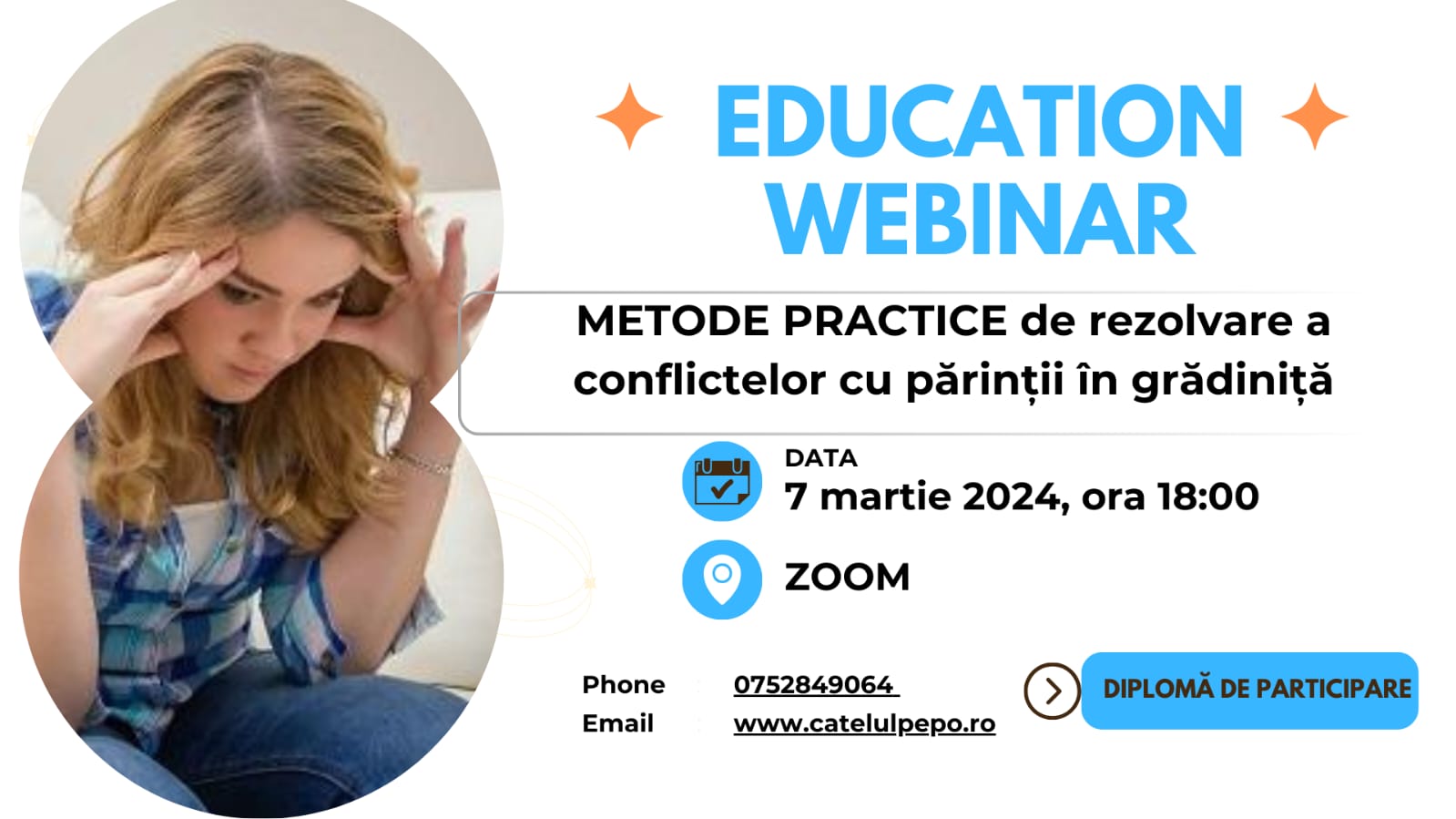 Participanții vor avea ocazia să învețe din exemple practice și să participe la discuții și exerciții interactive pentru a-și consolida abilitățile în gestionarea conflictelor cu părinții. Scopul webinar este să ofere instrumente și resurse practice pentru crearea relațiilor dintre școală și familie și pentru crearea unui mediu de colaborare și încredere în beneficiul dezvoltării copiilor.