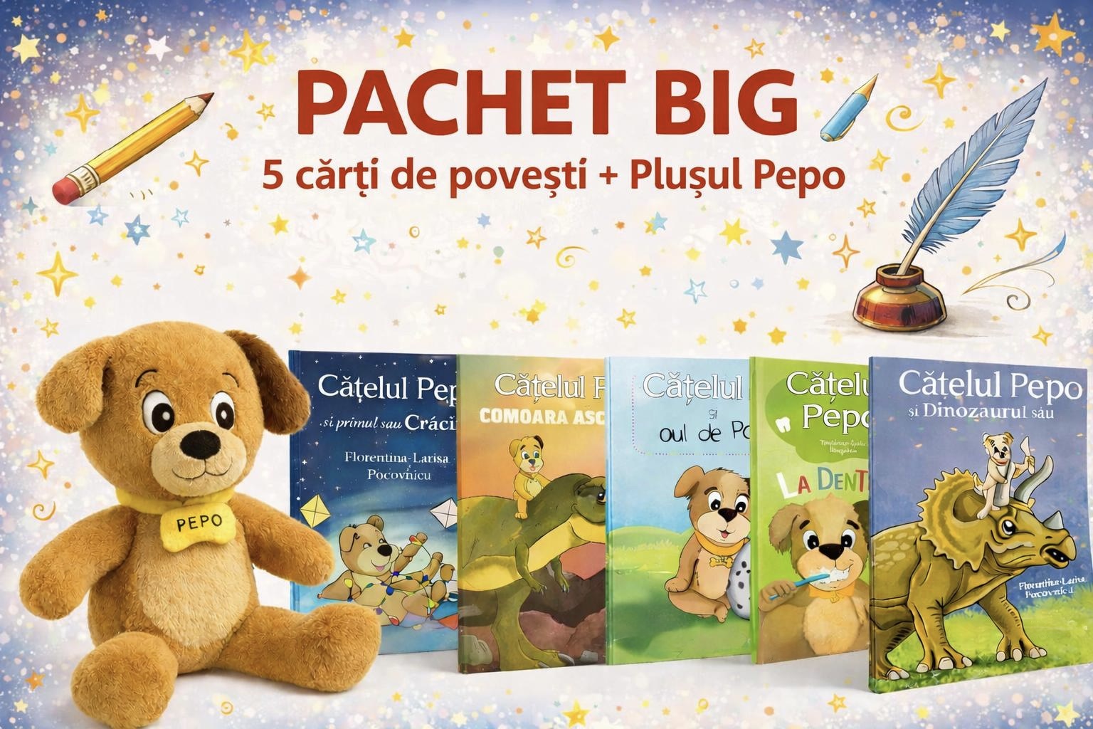 Setul cuprinde 5 cărți de povești cu Cățelul Pepo – Cățelul Pepo și dinozaurul său, Cățelul Pepo și comoara ascunsă, Cățelul Pepo la dentist, Cățelul Pepo și oul de Paște, Cățelul Pepo și primul său Crăciun – plus plușul Pepo, prietenul perfect de îmbrățișat.