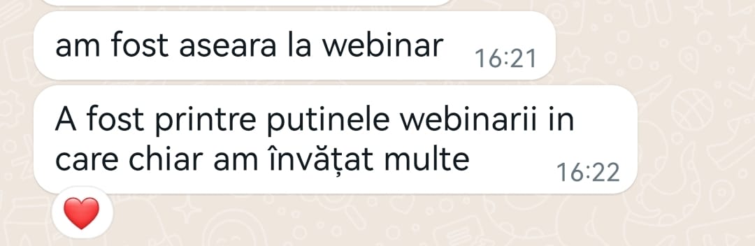 Momentan nu mai sunt locuri, va multumim pentru interes si va asteptam la urmatorul webinar. Urmariti-ne pentru a afla data exacta.
